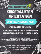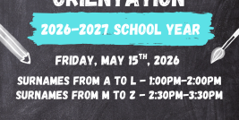 Please join us for our Kindergarten Orientation on Friday, May 15th, 2026. Surnames from A to L will attend from 1:00PM-2:00PM and surnames M to Z will attend from 2:30PM-3:30PM. Our kindergarten team will share everything you need to know to help your child get ready for an exciting and successful start to school!